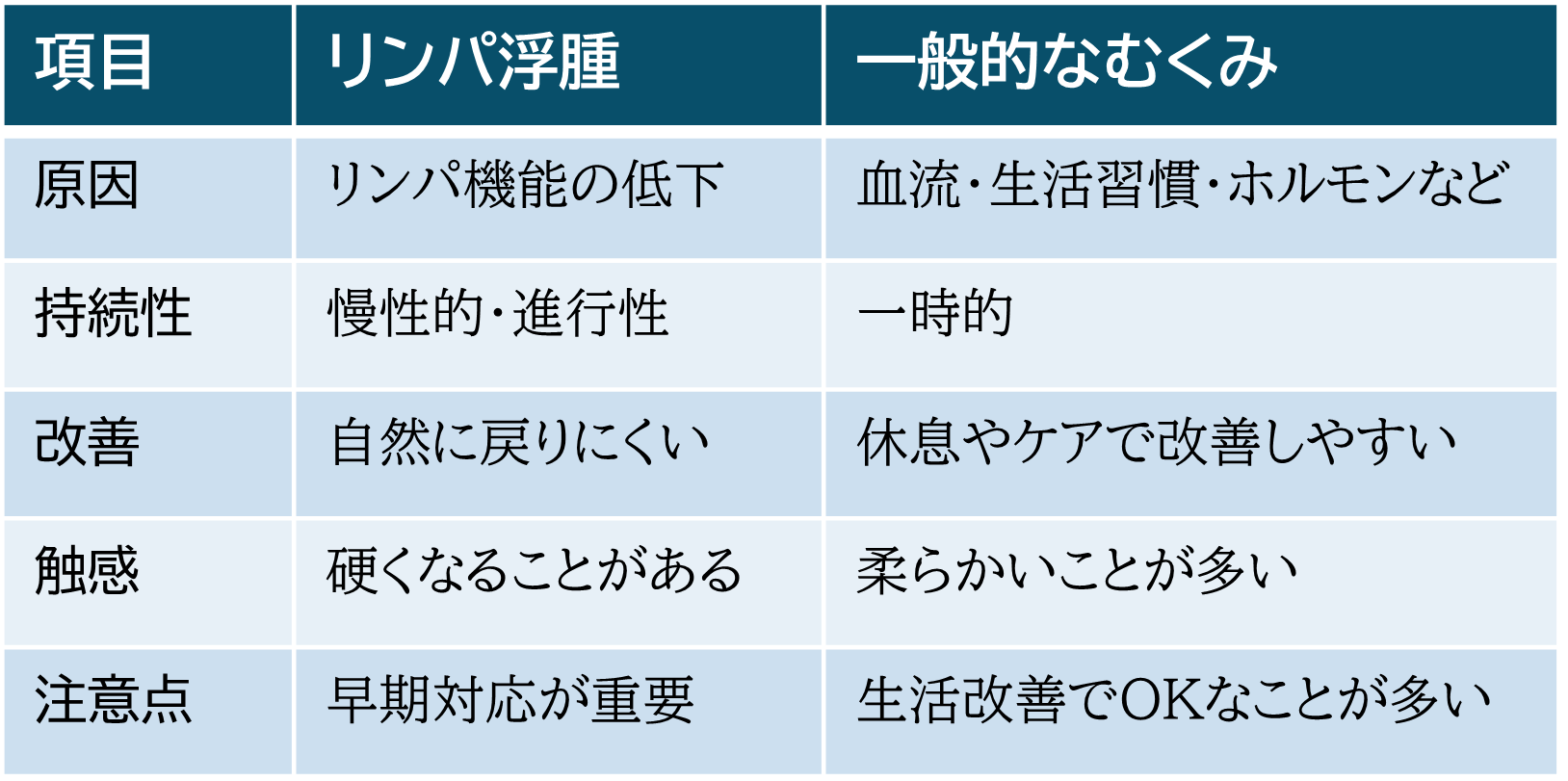 リンパ浮腫と一般的なむくみは、見た目が似ていても本質的には別のものです。